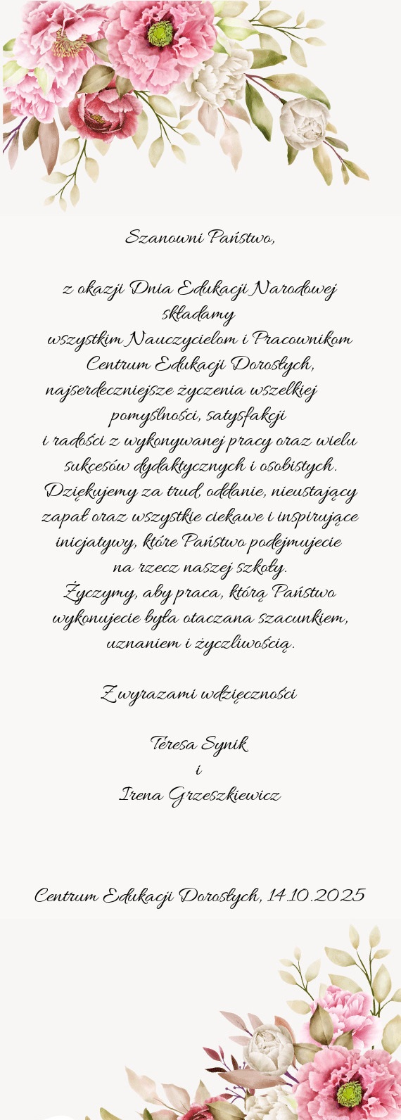 13 października 2025 0 Wysłane przez: CED Brodnica ŻYCZENIA Poprzedni artykuł "Wyzwania są naturalną drogą rozwoju, nie uciekaj od nich tylko przyjmuj je jako szansę" Następny artykuł Brak historii do pokazania!
